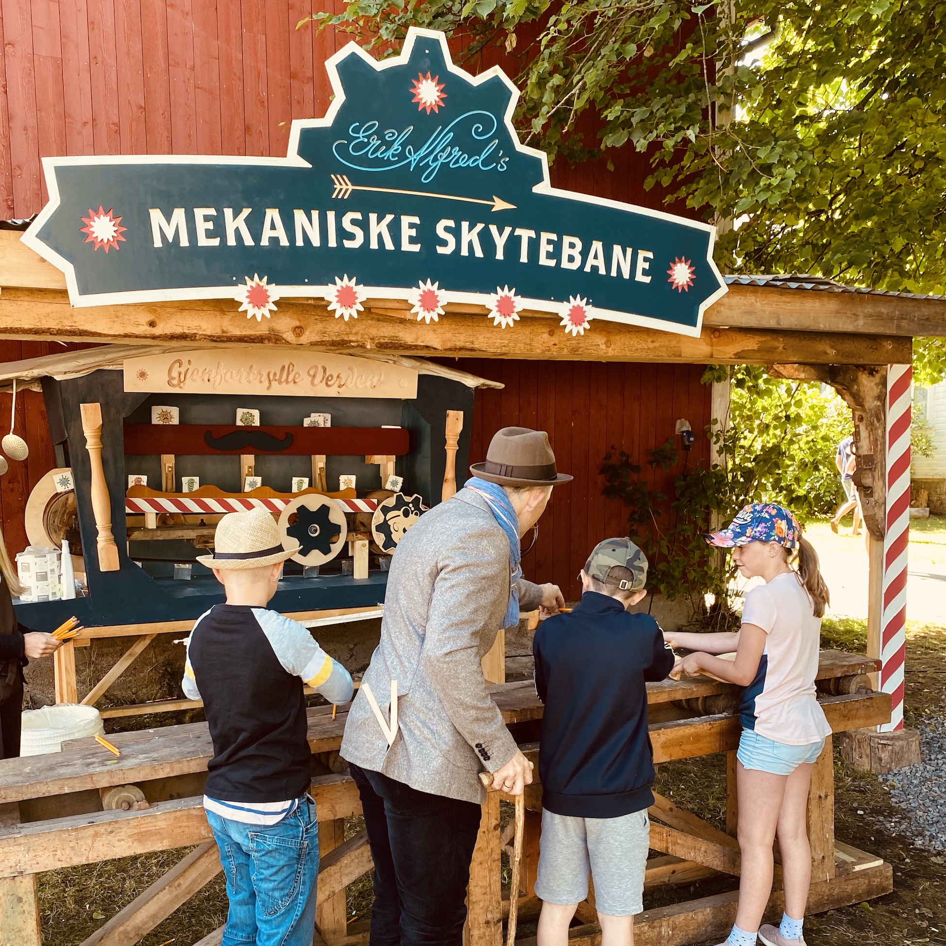 Barn og voksne ved skytebane i fornøyelsespark.