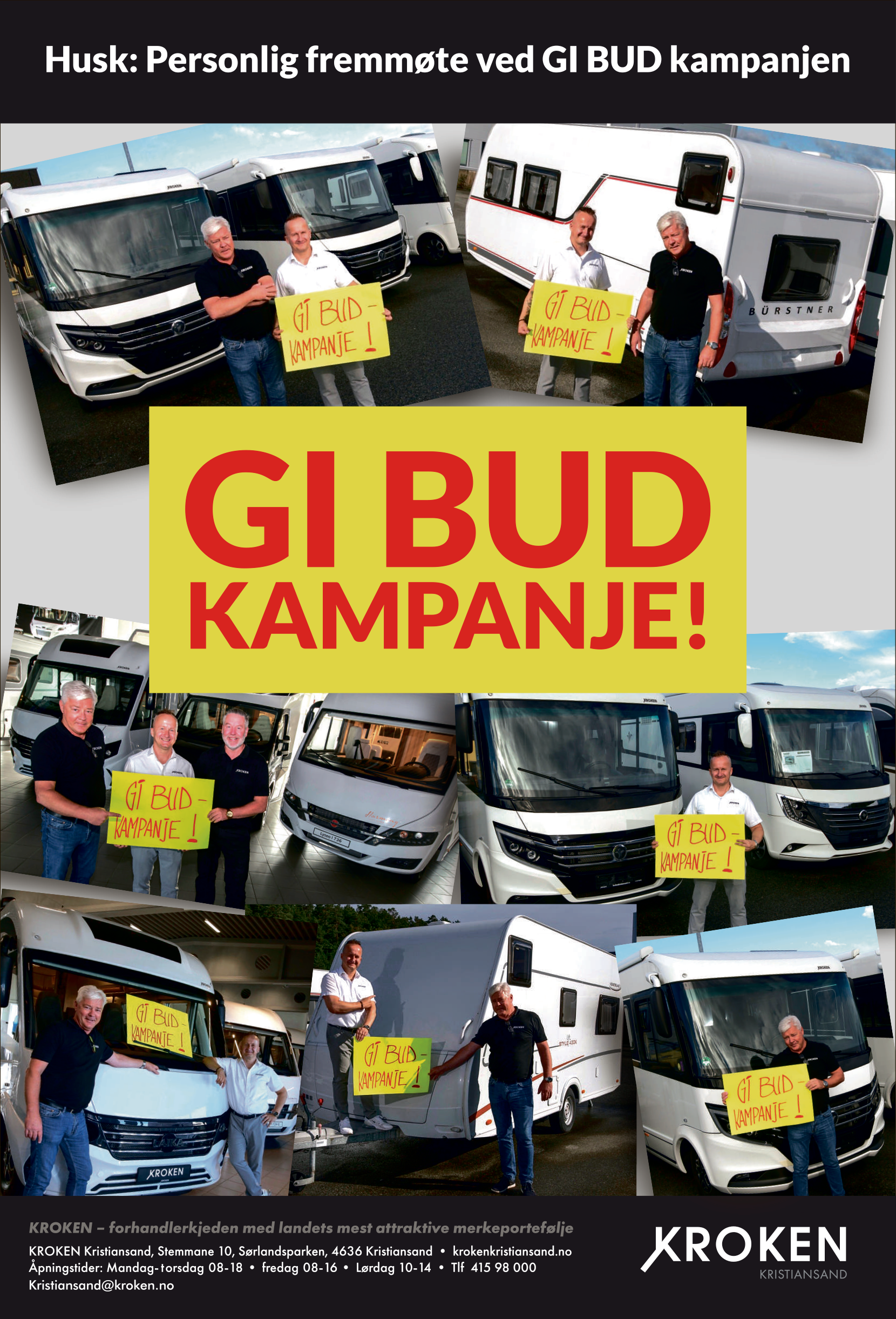 Han ser frem til spennende dager fra førstkommende torsdag, fredag og lørdag hvor det skal bli ekstra hyggelig å ta turen innom, gjerne for hele familien. Å gå til anskaffelse av bil eller vogn er jo noe som involverer store og små. For å gjøre det ekstra hyggelig blir det servering av pølser, boller, kake, is og brus. Han og kollegaene har 6-7 bobiler og to vogner som legges ut til budrunde, overliggere som er fabrikknye, men som de gjerne vil ha ut.