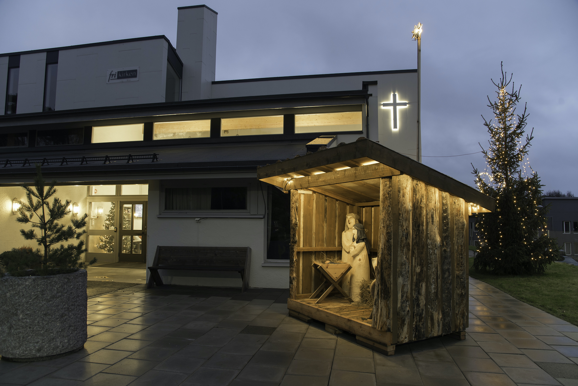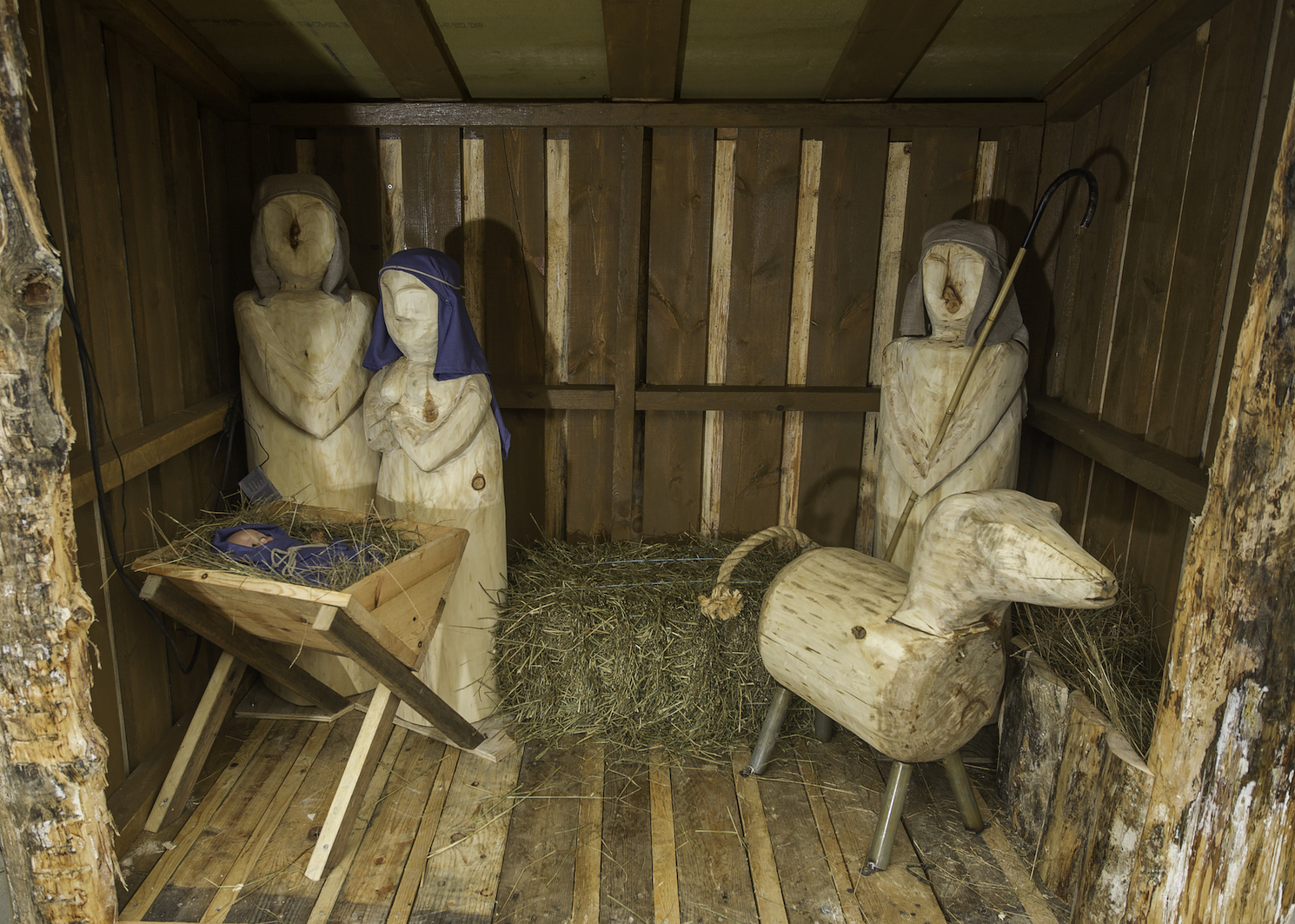 RANDESUND: Arvid Høyåsen syntes noe manglet ved inngangen til kirka til jul. Dermed tok han motorsaga i egne hender og fikset en komplett julestall med Maria og Josef med Jesusbarnet som har fått selskap av en gjeter og en sau.
