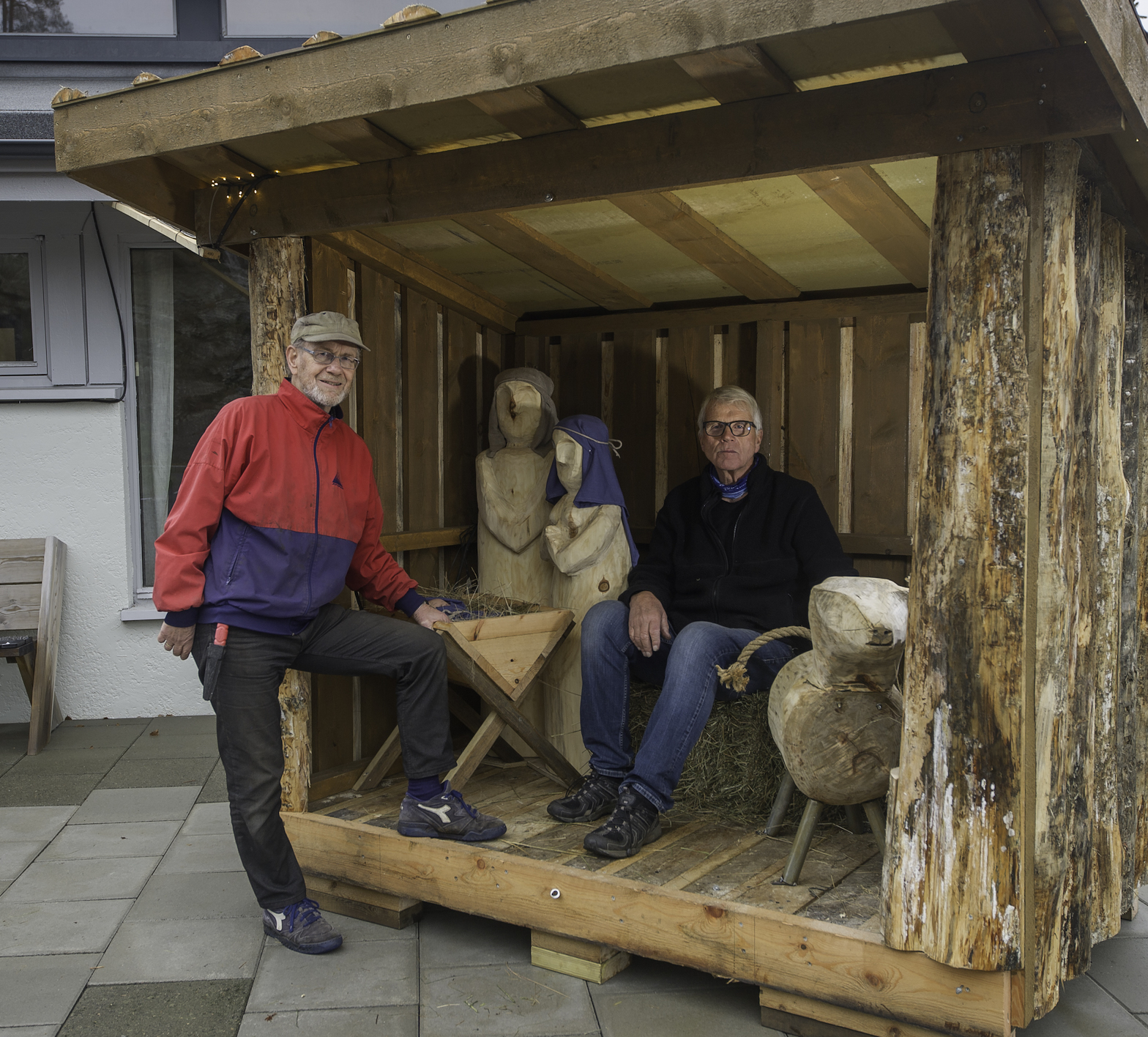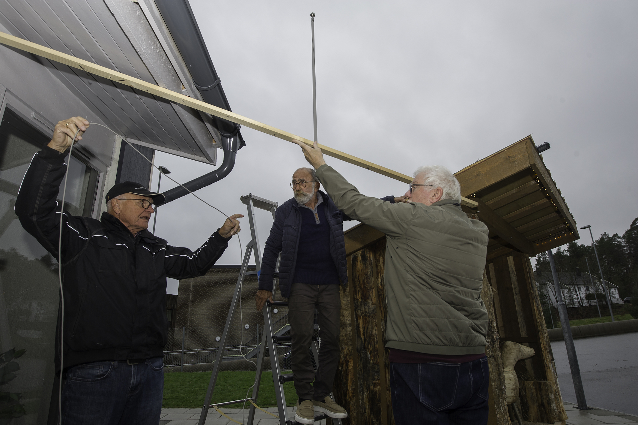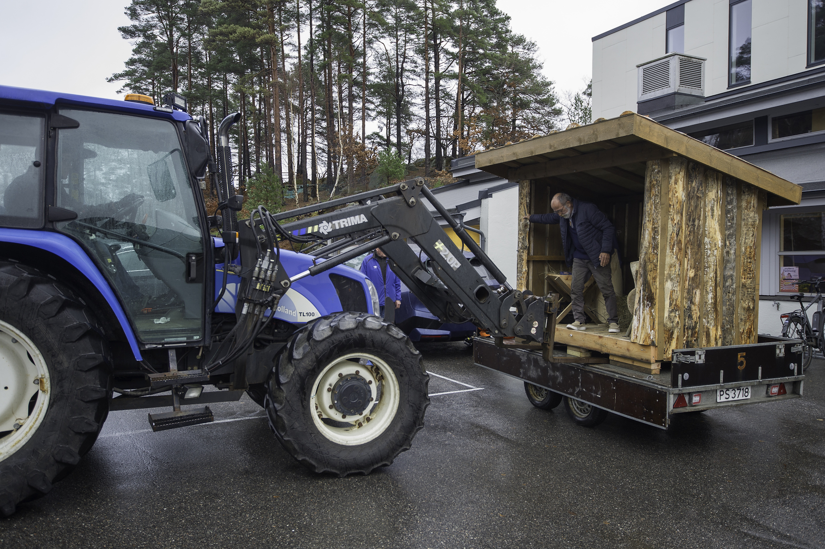 –Jeg begynte jobben 23 september, og materiale var osp som jeg har felt hos en venn som har hytte i Høvåg. Det har blitt noen timer med motorsag og andre verktøy for å forme figurene. I tillegg har jeg snekret selve stallen av hunved som jeg har fått fra en kar i Birkenes, opplyser Arvid som er i full sving med traktoren for å løfte stallen av hengeren og manøvrere den på plass ved inngangen til Randesund frikirke.