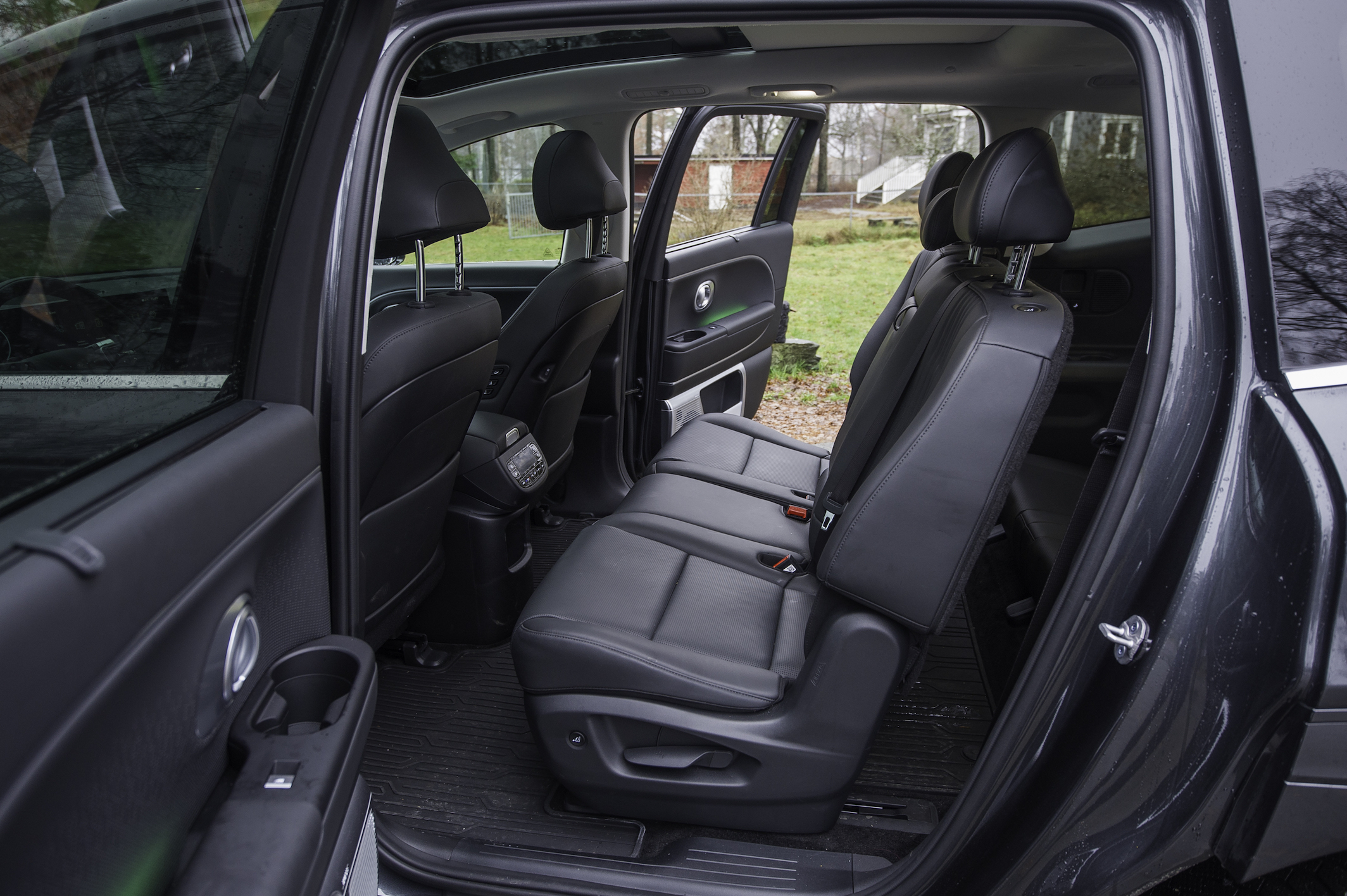 Det svake punkt i mange 7-setere er tredje seterad som gjerne oppleves som en nødløsning. Det blir trangt og det er krevende å komme på plass. Det er ikke slik i Ioniq 9: Her kan to voksne finne seg greit til rette. Seteryggvinkelen kan dessuten reguleres elektrisk. Adkomsten byr heller ikke på store utfordringer når midterste rad felles ned og skyves fremover.  Setet i midten byr rimeligvis på mer plass, her er det nesten overdådig. Vil man toppe det med enda mer komfort kan bilen leveres som seks seter, da er «benken» byttet ut med to kapteinstoler som kan reguleres i alle mulige retninger.